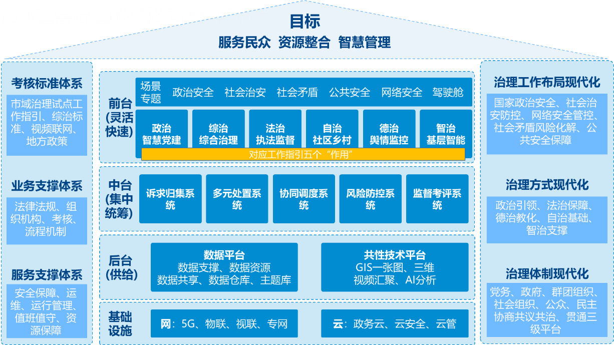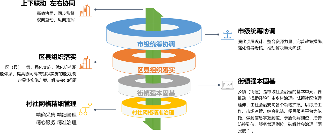 明确各个层级的业务定位,确定联动关系,找准各自定位,形成可以实施的业务架构。通过联动机制,打通上下层级,完成纵向一体;横向联通职能部门,形成平级联动;以督查考核建立向下监管机制,共同形成“上下联动,左右协同”的市域社会治理工作机制。