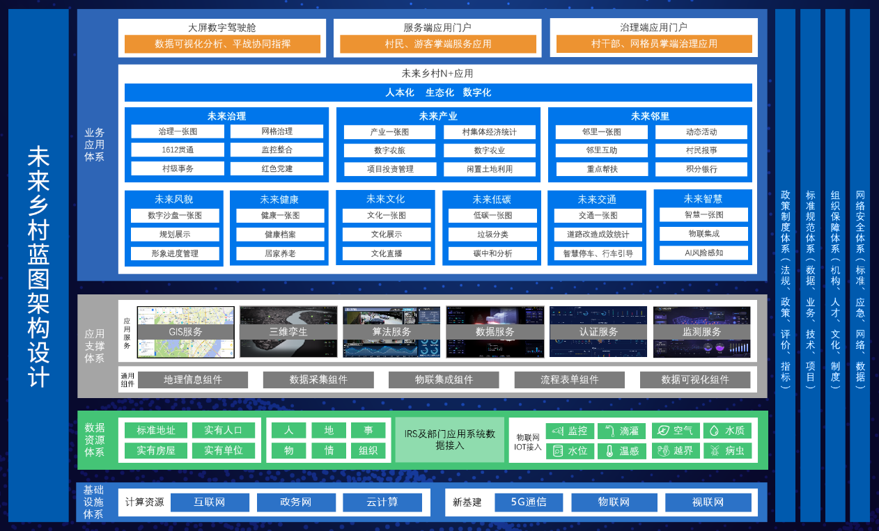 挖掘、归集、整合乡村自有数据资源,调用、回流、集成乡村的已建系统数据,构建乡村数字驾驶舱;融合未来乡村九大场景,幼有所育、学有所教、劳有所得、住有所居、文有所化、体有所健、病有所医、老有所养、弱有所扶、行有所畅、事有所便。 |