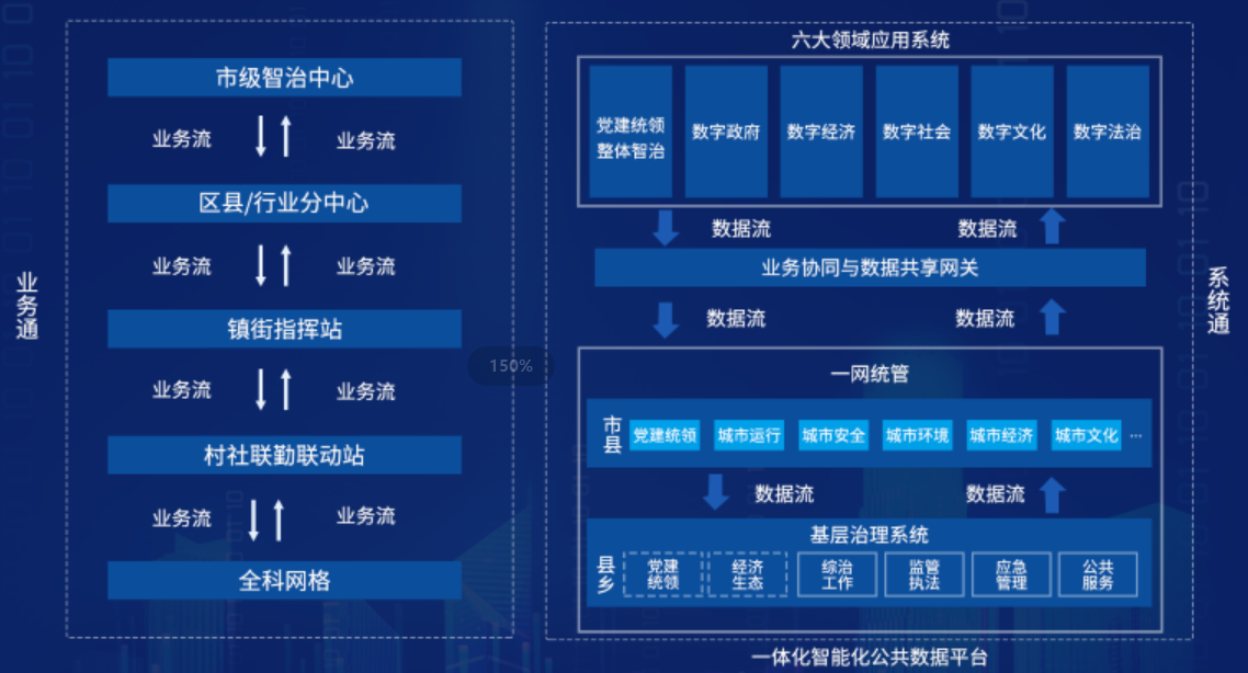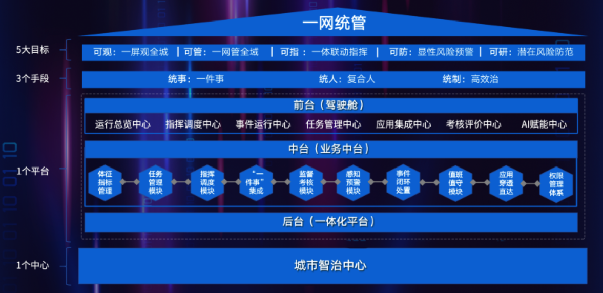 一网统管解决方案一网统管依托“1612”体系,在市级层面围绕党建统领整体智、数字政府、数字经济、数字社会、数字文化、数字法治六大领域,贯通六大领域的综合应用向区县延伸、集成,构建纵向贯通、横向集成、全链条闭环的“1+1+3+5”城市管理新模式,打造全国“城市智治”标杆。 |