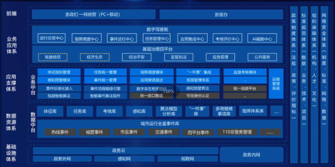 一网统管系统遵循浙江省数字化改革“四横四纵”整体架构体系,建设包含事件库、体征库、人物库、考核库等构成的城市运行数据资源,完善一体化智能化公共数据平台数据资源体系;按照“复用共享”的原则以组件化的形式利用一体化平台业务支撑体系提供空间建模、智能研判、物联感知解析等能力供给,同时构建以体征管理、任务管理、指挥调度等九大能力构成的城市运行应用支撑体系;业务应用体系打造“七大中心”,通过数据和业务接口对接的方式,实现上下贯通;业务应用系统以数字驾驶舱为核心,实现城市运行态势的统一展示、城市主要业务事件的统一监管、城市运行异常事件的统一预警、城市事件处置统一指挥。